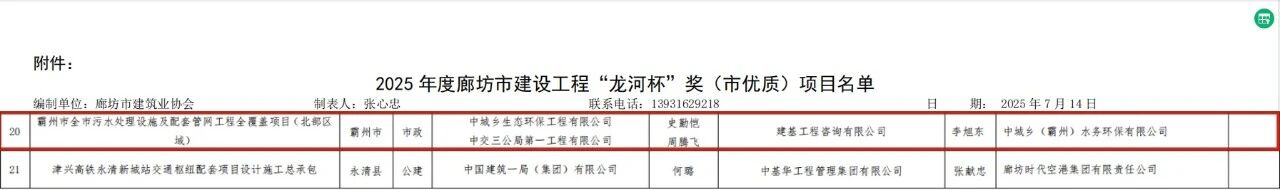 近日,河北省廊坊市建筑業協會公示了《關于公布2025年度廊坊市建設工程“龍河杯”獎(市優質)工程項目名單的通知》,公司監理的霸州市全市污水處理設施及配套管網工程全覆蓋項目(北部區域),憑借高標準的質量管控體系與創新實踐的管理模式成功入選,榮膺廊坊市優質工程“龍河杯”獎。