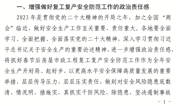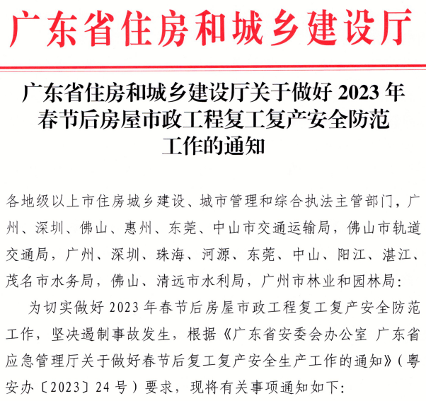 近日,廣東省住建廳發布《廣東住建廳關于做好2023年春節后房屋市政工程復工復產安全防范工作的通知》。