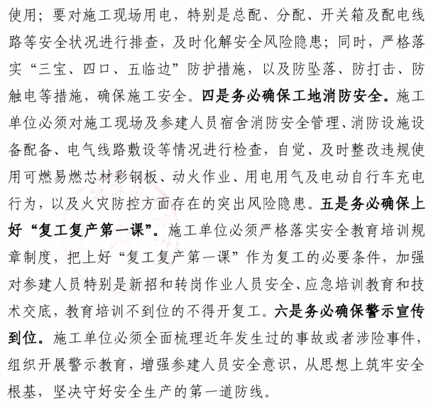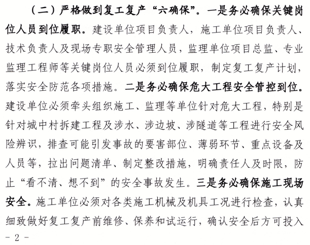 建設單位項目負責人,施工單位項目負責人、技術負責人及現場專職安全管理人員,監理單位項目總監、專業監理工程師等關鍵崗位人員必須到位履職,制定復工復產計劃,落實安全防范各項措施。
