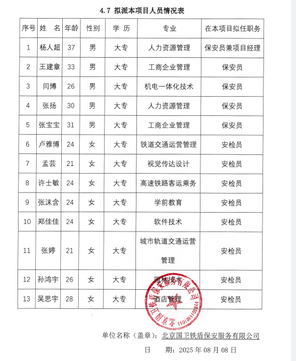 本次采購內容為聘請不少于13名安檢安保人員(8名女性安檢人員及5名男性安保人員)在采購人指定崗位提供安檢安保服務(詳見競爭性磋商文件第二章項目需求) | 北京國衛鐵盾保安服務有限公司 | 423000.00 |